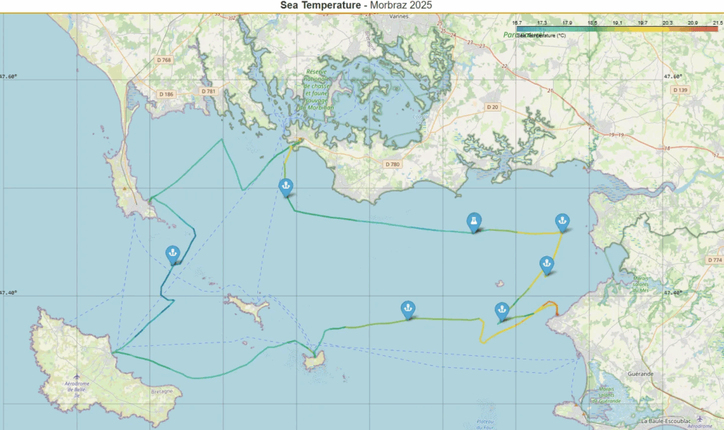 La campagne Mor Braz 2025 s’est déroulée durant trois mois, du 1er juillet au 31 septembre 2025, dans les zones d’études stratégiques de la baie de Quiberon, des estuaires de la Loire et de la Vilaine, ainsi que plus largement dans le Golfe de Gascogne. Cette initiative de sciences participatives visait à impliquer les plaisanciers bretons dans la collecte de données océanographiques, en leur proposant d’embarquer des instruments scientifiques à bord de leurs voiliers pour mesurer la température et la salinité de surface. L’objectif scientifique principal consistait à étudier le panache des grands fleuves bretons (Vilaine et Loire) et leur influence sur les écosystèmes côtiers, tout en signalant les phénomènes d’eaux colorées en partenariat avec le programme Phenomer.
